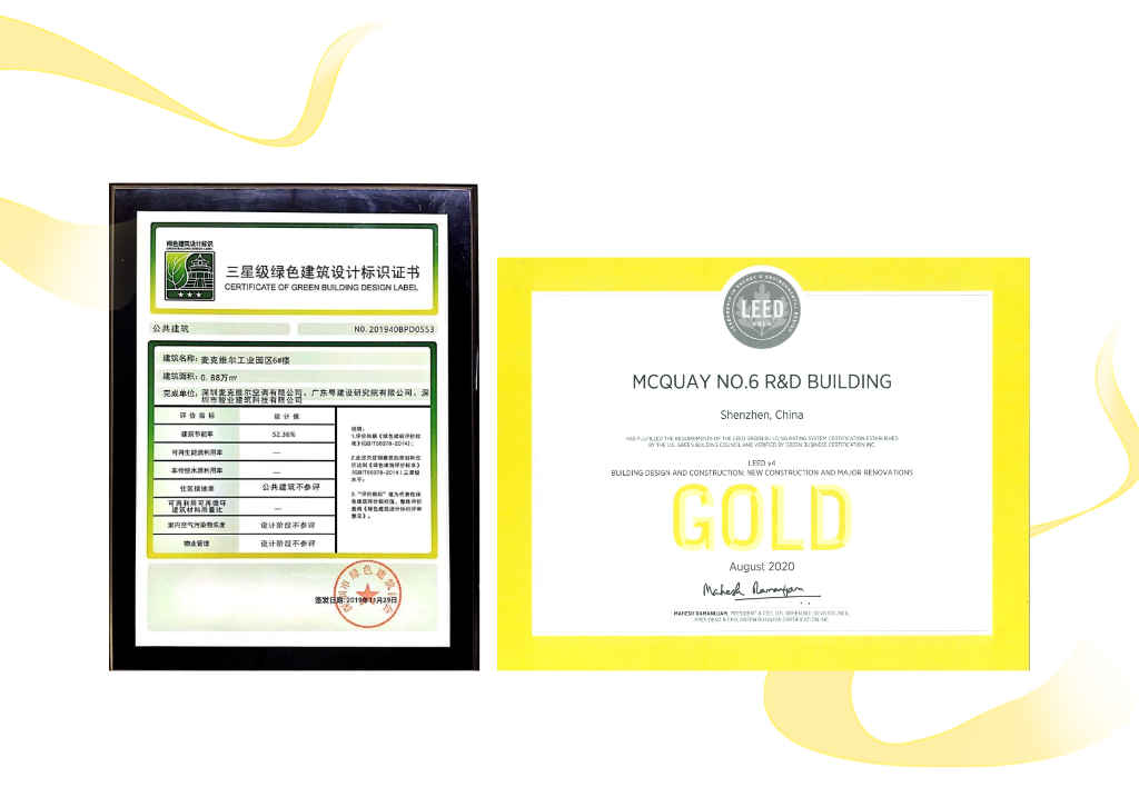 麦克维尔深圳工厂新建研发大楼时,引入楼宇智控管理系统,集中规划控制办公区域能源应用,并采用先进的磁悬浮中央空调,获得《三星级绿色建筑设计标识证书》及LEED金质认证。