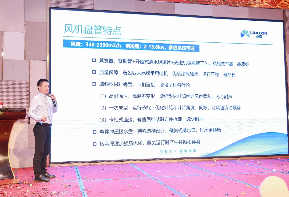 在末端产品及技术宣讲环节,瓴信销售技术代表区志康先生表示末端产品与主机产品同等重要,作为瓴信空调的拳头产品——LXFP系列风机盘管机组采用四大知名电机品牌和高分子增强型材料蜗壳,高能效低噪音,安装和拆卸简单,灵活应用在各个场所。