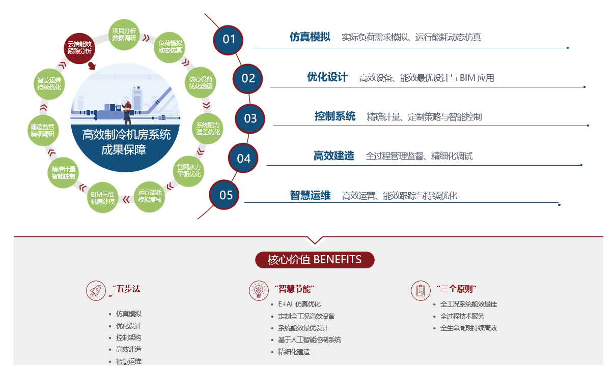 美的高效机房解决方案包括了仿真模拟、优化设计、控制系统、高效建造及智慧运维五个步骤,覆盖项目设计、建造及运维阶段,能够保证空调系统全生命周期的高效运行。