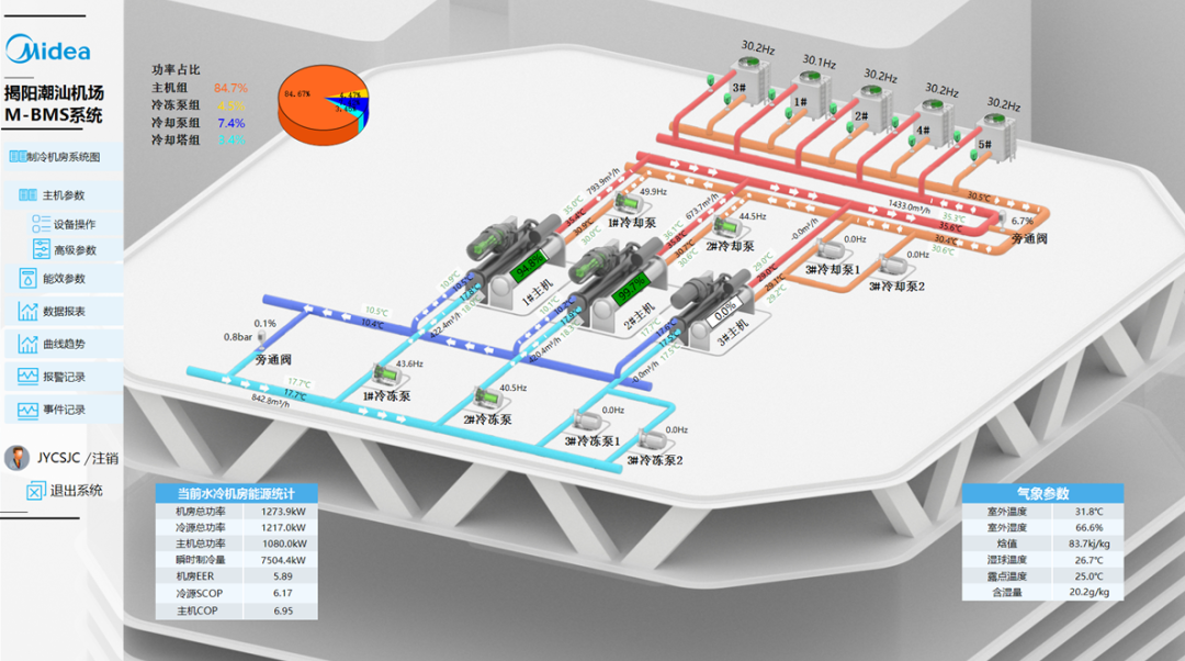 为此,美的楼宇科技为潮汕机场提供了专业的水机智能诊断服务,采用“仿真模型+AI驱动”的方式,使得水机运行状态清晰可视,从而保障服务于潮汕机场的美的变频直驱离心式冷水机组的安全、稳定、高效运行。
