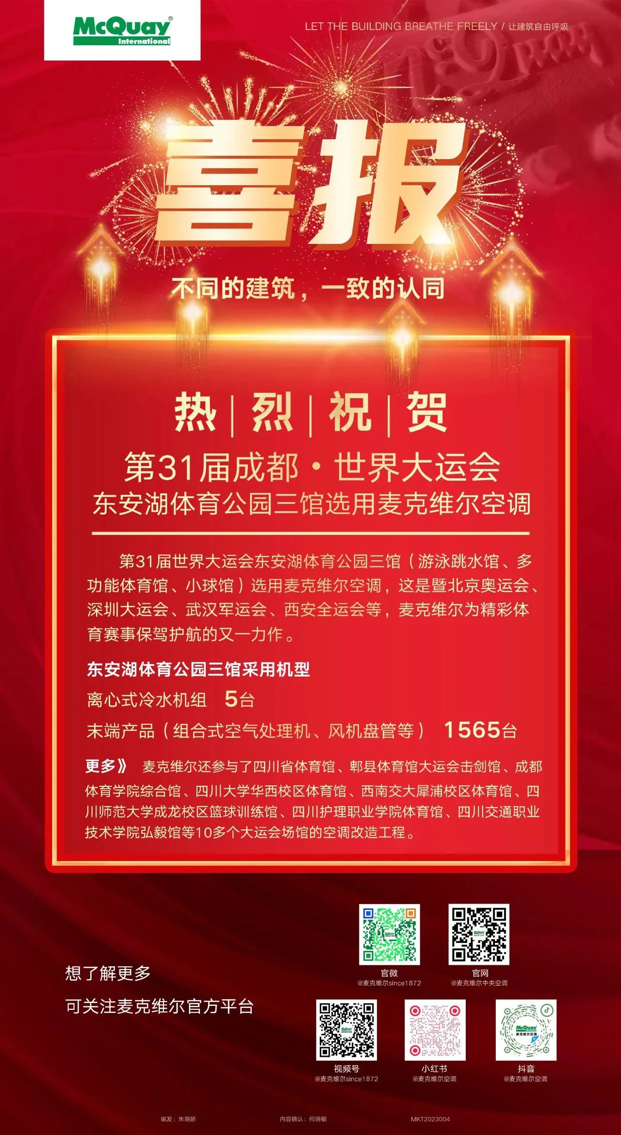麦克维尔也参与其中,包括东安湖体育公园的三馆、东安湖大运媒体中心、酒店以及10多个场馆改造选了麦克维尔空调。大运会在即,麦克维尔保赛服务团队已经做好了准备,将常驻赛场为赛场空调系统保驾护航。