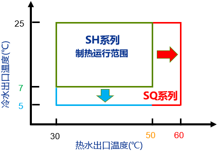 与SH系列常规热泵离心式冷水机组相比,SQ系列为高温热泵定制,最大热量更高,最高温度更高,最大压头更高。因此,实际适用的范围更广。