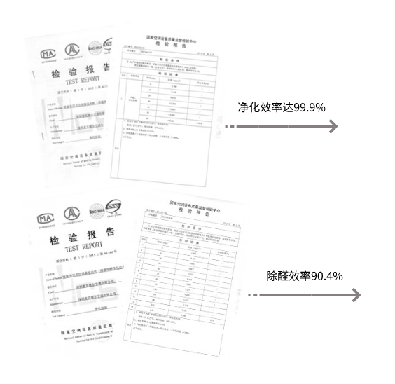检测方法:在30m3环境测试舱内测试,暗装吊顶式空调器室内机搭载两个PM2.5过器, 将过滤器拼接在一起(长度方向),测试档位为SHF档,测试时间为1h,净化效率99.9%。