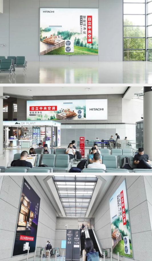 日立中央空调机场灯箱广告再次来袭,本次机场广告的上刊投放包括上海虹桥航站楼的登机口及候机厅等主要通道。
