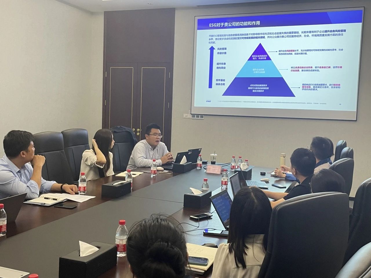ESG项目启动会是公司ESG专项领导与工作机构成立以来的第一次会议,从ESG发展与监管要求、深化ESG管理实践、ESG后续配合工作三个方面展开,结合实际案例的分享,让大家深入理解ESG。聚焦目前较为主流的MSCI评级体系,工作组成员共同探讨MSCI ESG评级在环境与社会层面考察的关键议题、评级逻辑及关键议题解析、同业ESG实践情况对标分析等。会议分析并梳理了工作组成员后续需要参与配合的主要工作及项目推进安排。