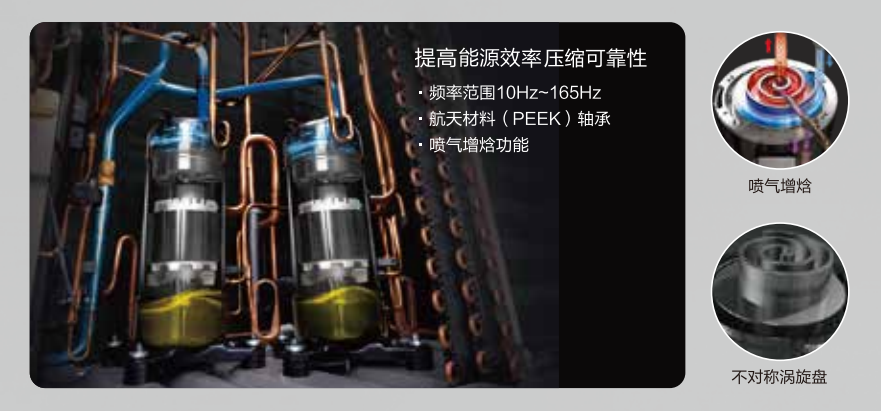 LG MULTI V 5 PRO采用原装进口的第五代压缩机,运转频率低至10Hz,高达165Hz,在恶劣温度条件下也可以轻松应对负荷变化,还可通过喷气增焓提高制热性能,在低温条件下也能稳定运行,营造高效省心的空间环境。