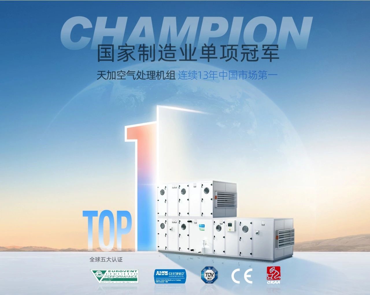天加Airpioneer空气处理机是国家工信部单项冠军产品,蝉联中国中央空调市场13年NO.1,沉淀洁净技术精华,引领行业风向。