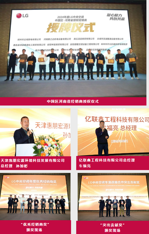 会议最后,LG中央空调还举行了中国区河南省经销商授权仪式,给22家门店授牌,并对2023年华北区域市场表现卓越的经销商进行了表彰,为7名优秀经销商奖客户、3位突出贡献奖客户颁奖。获奖经销商代表天津惠朋宏源环境科技发展有限公司总经理孙加彬表示,此次获奖是对过去合作成果的肯定,也是对未来的期许,我们将通过双向赋能,与LG中央空调共进共赢;亿联鑫工程科技有限公司总经理车福亮表示,将继续与LG中央空调携手并进,再创佳绩。