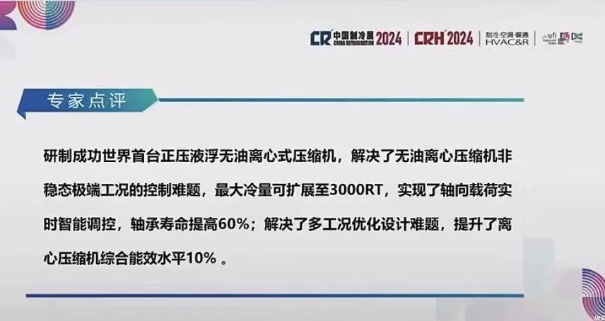 在2024中国制冷展金奖产品发布仪式上,行业专家对海信正压液浮无油离心式压缩机给予了非常高的评价,充分肯定了海信中央空调的行业领先的科技创新成果,“研制成功世界首台正压液浮无油离心式压缩机,解决了无油离心压缩机非稳态极端工况的控制难题,最大冷量可扩展至3000RT,实现了轴向载荷实时智能调控,轴承寿命提高60%;解决了多工况优化设计难题,提升了离心压缩机综合能效水平10%。”