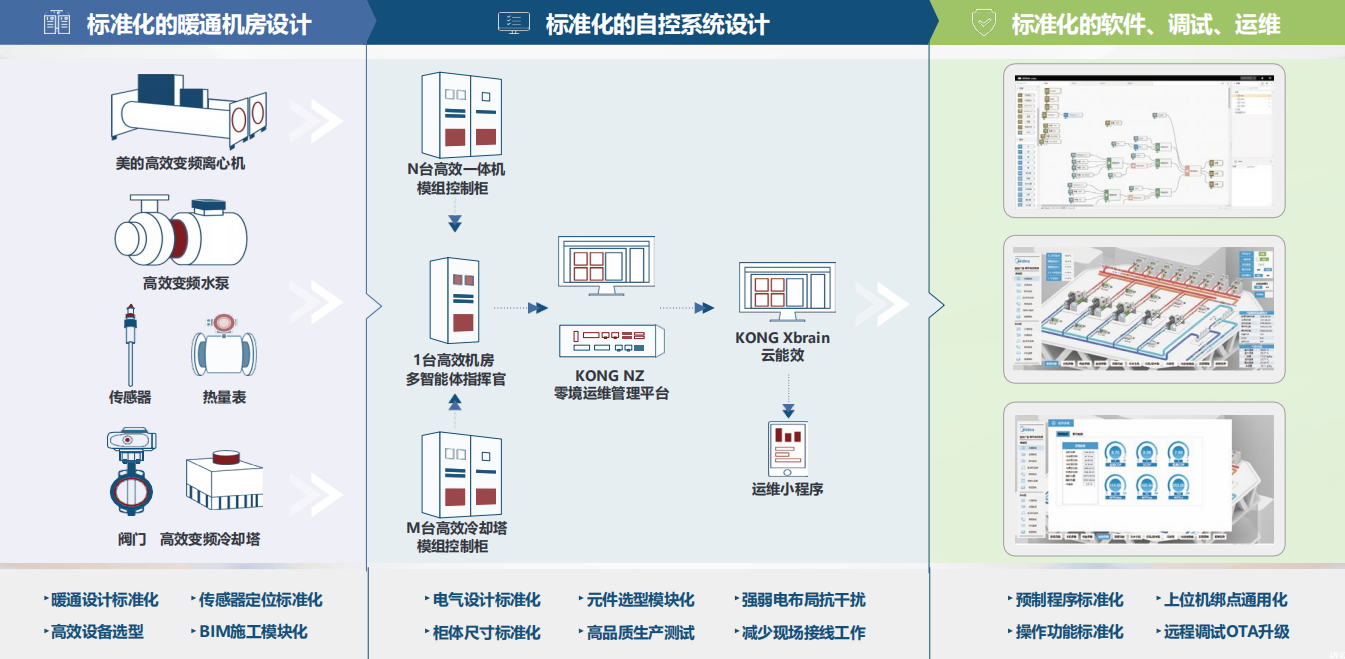 美的楼宇科技高效机房,坚持全面标准化、全面数字化、全面智能化,首创高效机房全面标准化解决方案,通过暖通+自控+程序及软件的软硬一体化设计,虚拟调试平台参数调优,云能效平台智慧运维,实现全链路以终为始的高效设计、建造和交付。