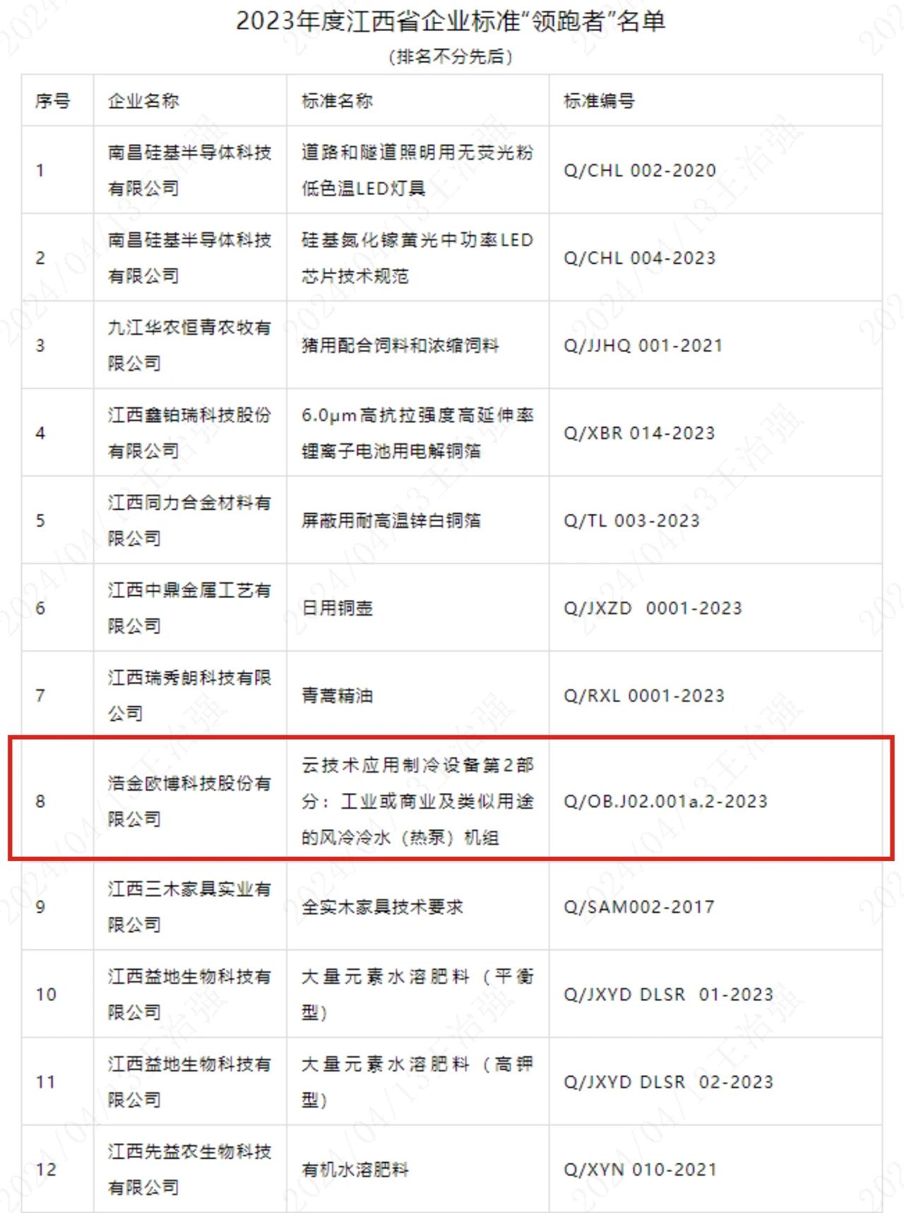 日前,省质量和标准化研究院公布了2023年度江西省企业标准“领跑者”名单!浩金欧博科技股份有限公司《云技术应用制冷设备第2部分:工业或商业及类似用途的风冷冷水(热泵)机组》(Q/OB.J02.001a.2-2023)企业标准获批江西省企业标准“领跑者”称号。