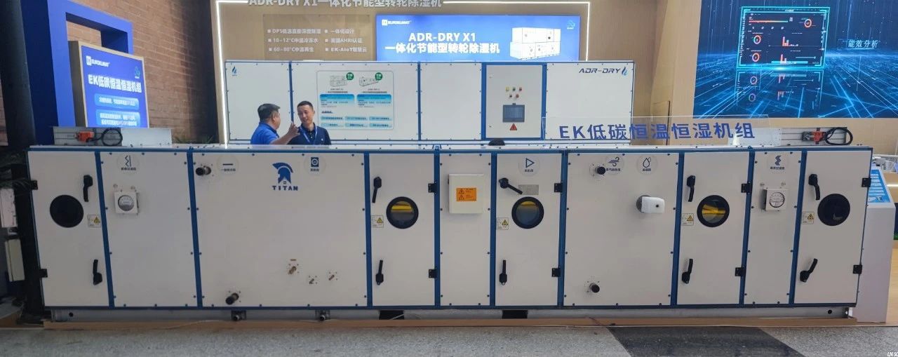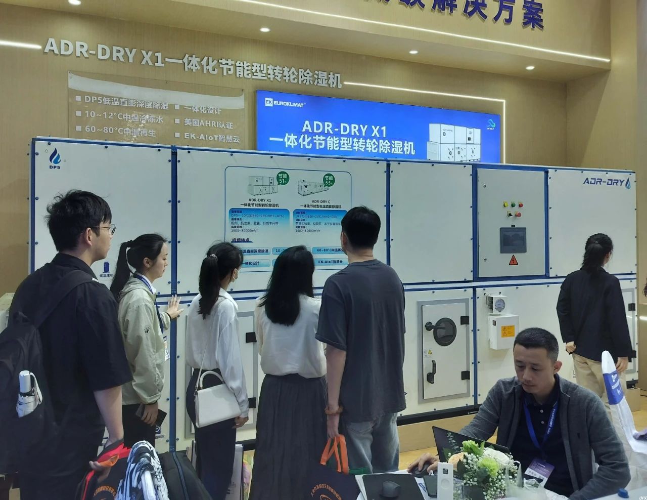 EK工业空调在药机展现场展示的是ADR-DRY X1一体化节能型转轮除湿机组,该机组采用DP5低温直膨深度除湿,新风预冷直达5℃,减少转轮除湿负荷,实现了60℃-80℃的中温再生,节能率最高可达50%以上,为企业解决制药车间除湿需求和除湿系统高能耗痛点。