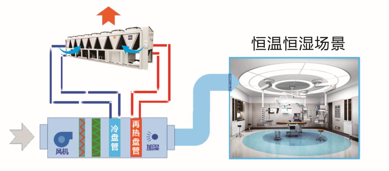 制药车间、实验室及产品留样室等洁净、恒温恒湿场所,常常面临恒温恒湿冷量需求大和空调系统再热阶段能耗高等问题,EK四管制冷热平衡机组可完美解决这一痛点。