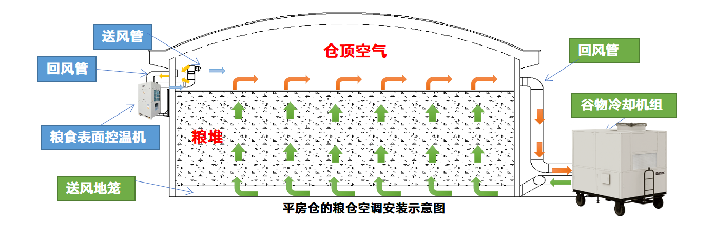 机组主要为了消除夏季太阳辐射传入仓内的热负荷,维持粮面平均温度在20℃以下。通常粮面机使用3-4月/年。(7-10月)