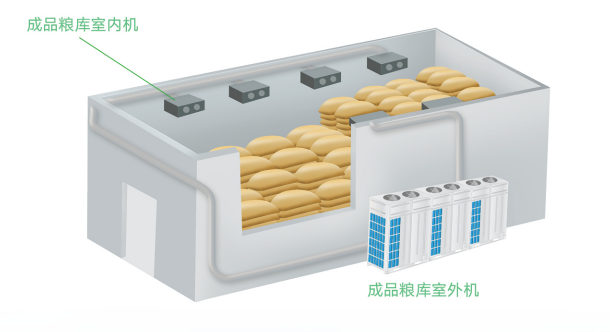 成品粮库专用空调专为成品粮仓使用环境设计,室内机采用射流封口远距离送风,送风角度灵活可调节,保证仓内温度均匀,系统采用变频控制技术,融入先进的变流量多联技术,系统节能高效。