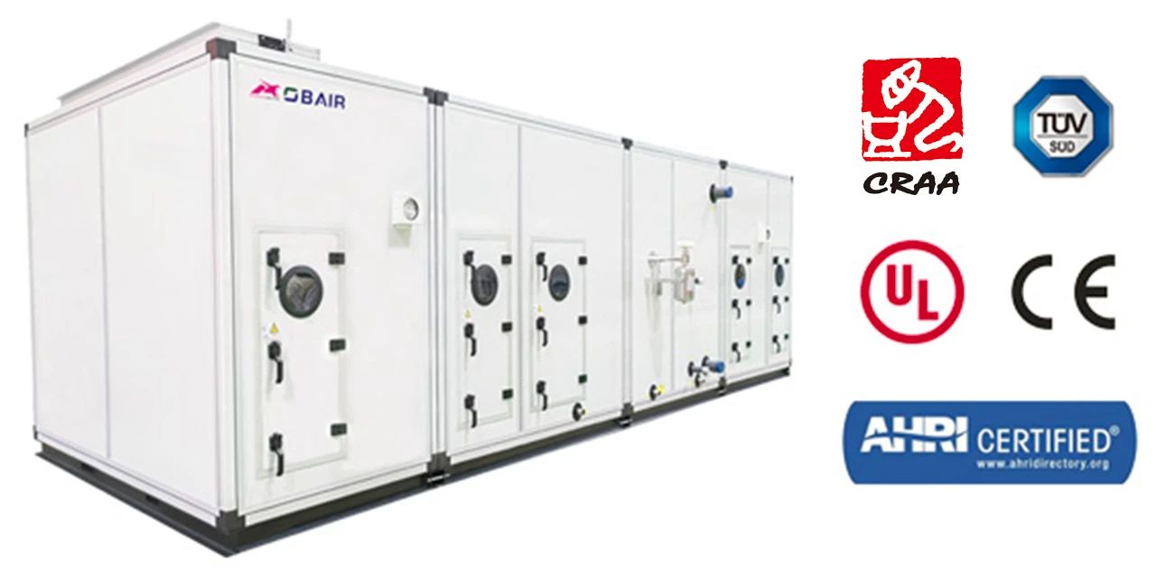 BLQ系列干盘管配合MAU+DCC+FFU系统,给循环风降温,承担洁净室内的显冷负荷。FP-K系列卡式风机盘管+ZKW系列组合式空气处理机组处理非洁净区的热湿负荷,降温的同时提供了预冷及粗滤的新风,为该区域提供了舒适室内环境。其中带转轮的ZKW系列组合式空气处理机作为转轮除湿机使用,为部分工艺提供了比常规冷却除湿更彻底的除湿效果。