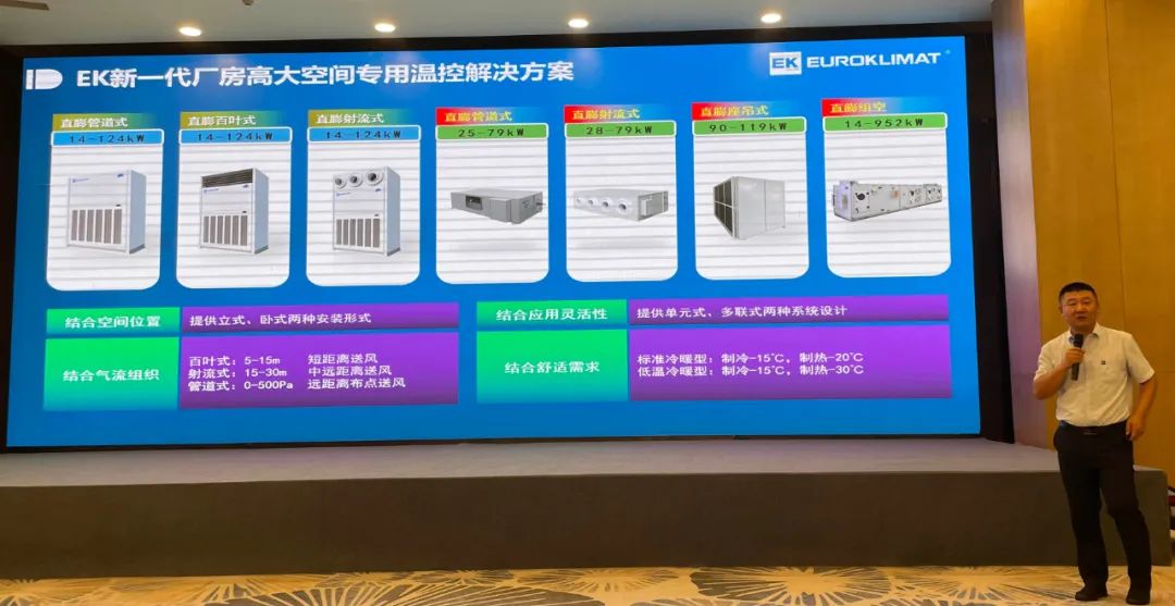 交流会期间,EK多联机事业部产品经理丁兆宣现场作了题为《高效集成冷站及多联机在工业领域的应用》的专题报告,详细介绍了EK节能低碳系统解决方案在工业应用场景的节能效果。