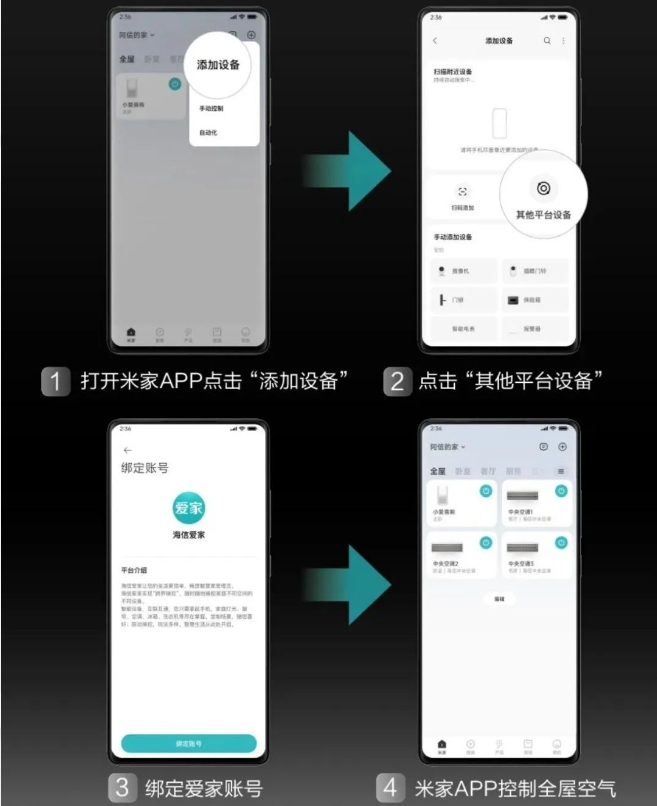5、绑定完成后,需要打开“米家APP”,点击添加设备,选择其他平台设备,绑定爱家账号后,就能用“米家APP”控制全屋空气啦。