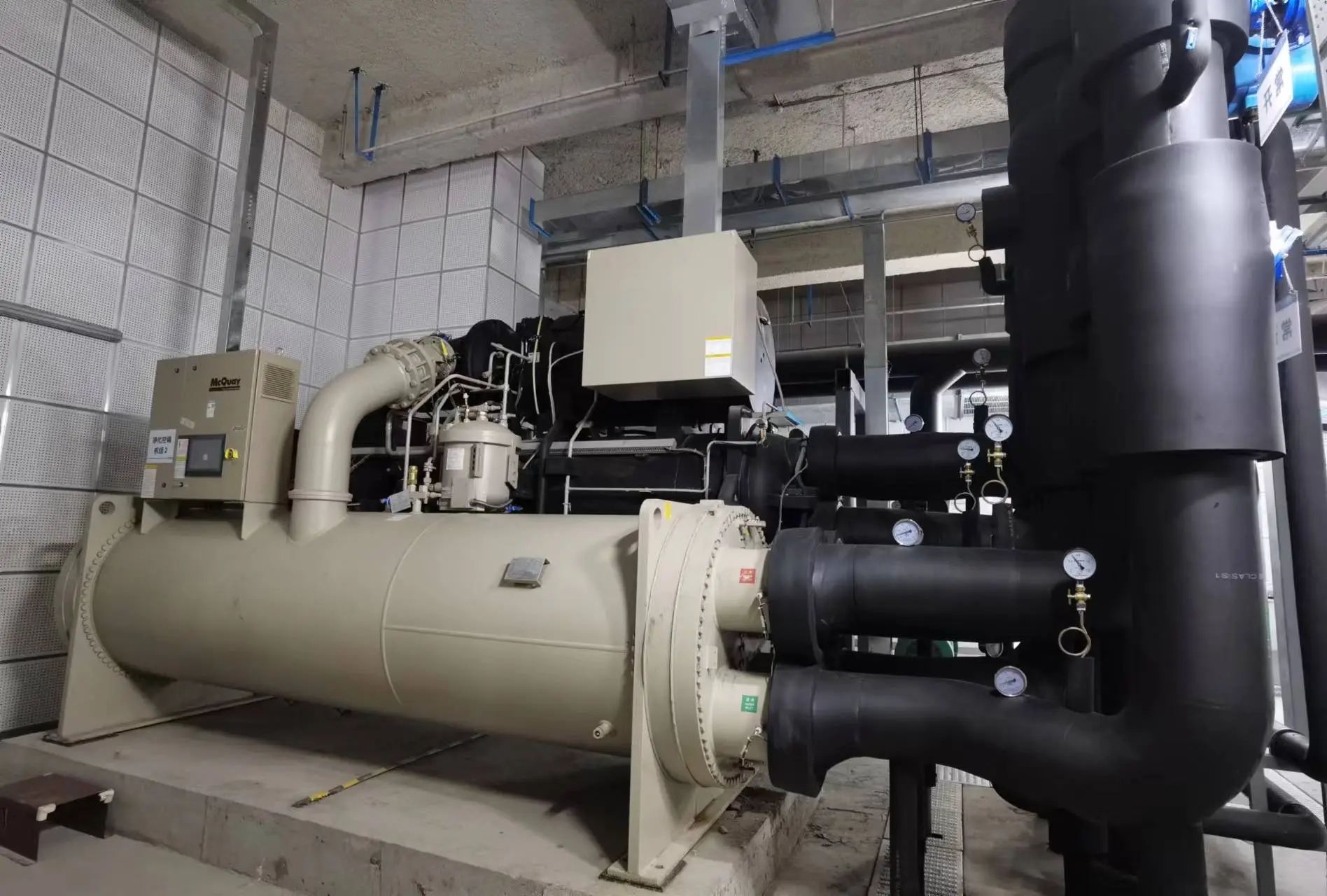 采用麦克维尔高效高压热回收离心式机组,通过回收冷凝器的高温冷却水的热量,循环利用,节约资源。