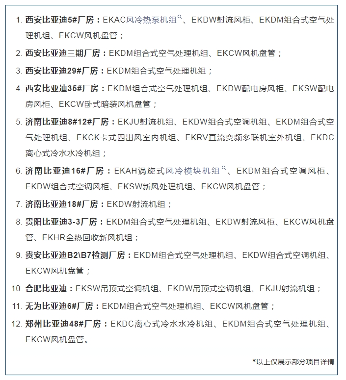 随着比亚迪版图的不断扩展,EK工业空调的身影频繁出现在其各大工厂。从西安比亚迪1#厂房、5#厂房、29#厂房、35#厂房,到济南的8#厂房、12#厂房、16#厂房、18#厂房,再到贵阳的3-3厂房、贵安的B2\B7检测厂房、无为的6#厂房和郑州的48#厂房,EK工业空调为其多个重要项目提供优质的暖通空调系统服务,助力比亚迪节能降耗和绿色发展。