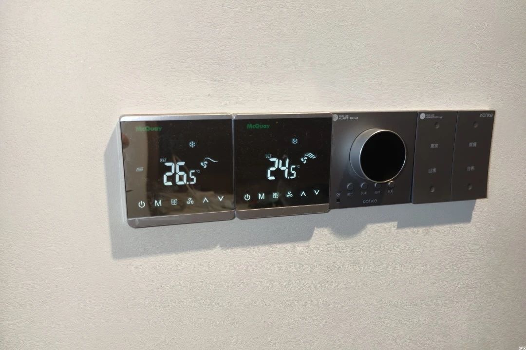温控器的品质与科技感,影响着项目的室内装修风格,麦克维尔MC328温控器采用极简的生活美学设计,超薄微弧机身,88%高清屏占比,搭配银色金属边框,金属与玻璃面板质感交相辉映,如艺术品般精雕细琢,与长沙绿地V岛意式极简的设计理念不谋而合。