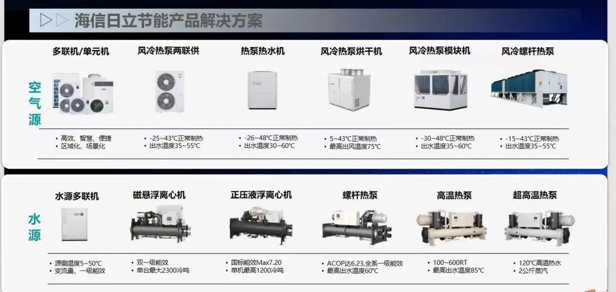 随后,详细介绍了海信日立的节能产品解决方案,重点分析了螺杆式85℃中温热泵机组和螺杆式120℃高温热泵机组的特点和优势。