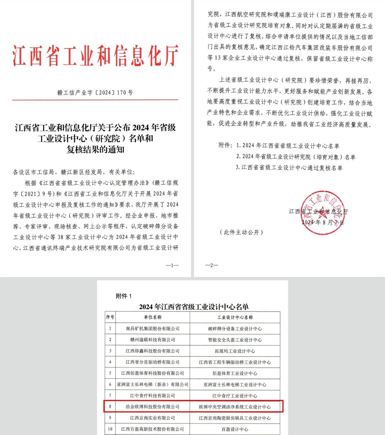 近日,江西省工业和信息化厅发布2024年省级工业设计中心认定名单,浩金欧博科技股份有限公司(简称“欧博股份”)榜上有名,认定名称为欧博中央空调洁净系统工业设计中心。