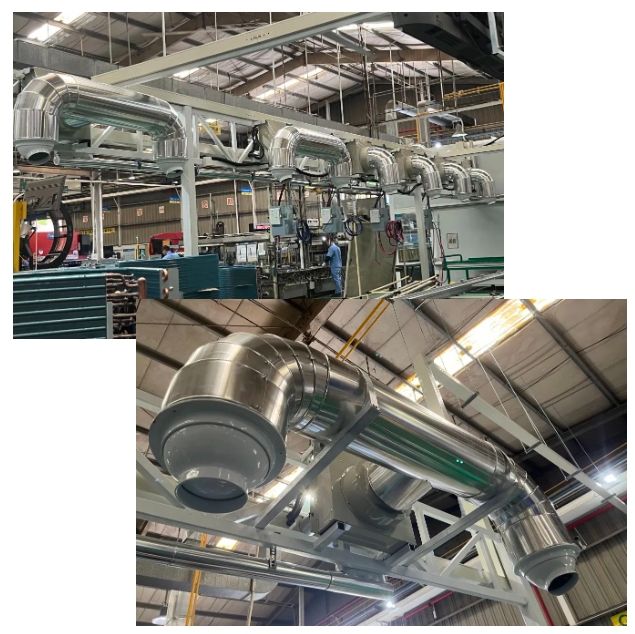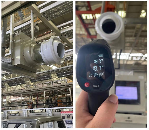 江淮某汽车厂项目目前有两期,一期40台内机于去年春季安装调试完成投入使用,二期16台于今年春季安装调试完成,现也已经投入使用。现场效果得到甲方的认可,出风温度在25℃~27℃,十分符合用户的预期。