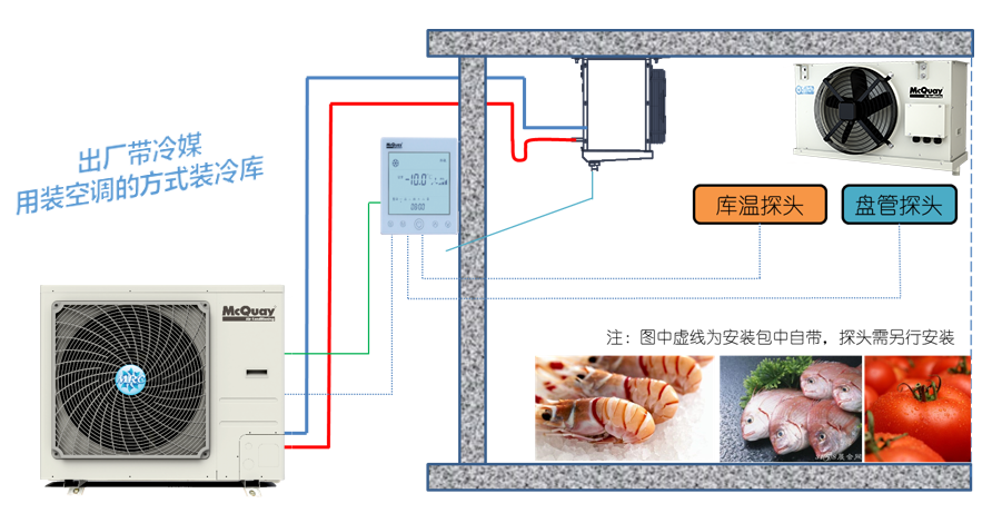 麦克维尔冷冻机外机一体化集成设计,搭配自主生产的冷风机,采用家用空调的安装方式,简化安装,电控精简,现场能效还原度高,内外机统一品牌控制器,运行更可靠。