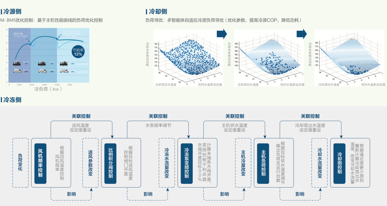 其中,美控高效机房算法库能够实现冷却塔散热自适应最优控制、冷水机组出水温度智能重设、水泵温压差智能双控、设备自寻优加减载控制、主机档位智能控制等功能,保证机房稳定高效运行。多智能体指挥官搭载全域协调寻优控制算法,通过融合数据驱动、机理模型与进化算法,实现水侧与风侧能效协同优化控制,以及全工况过程控制参数自学习调优,有效提高环控系统的整体能效与控制稳定性。