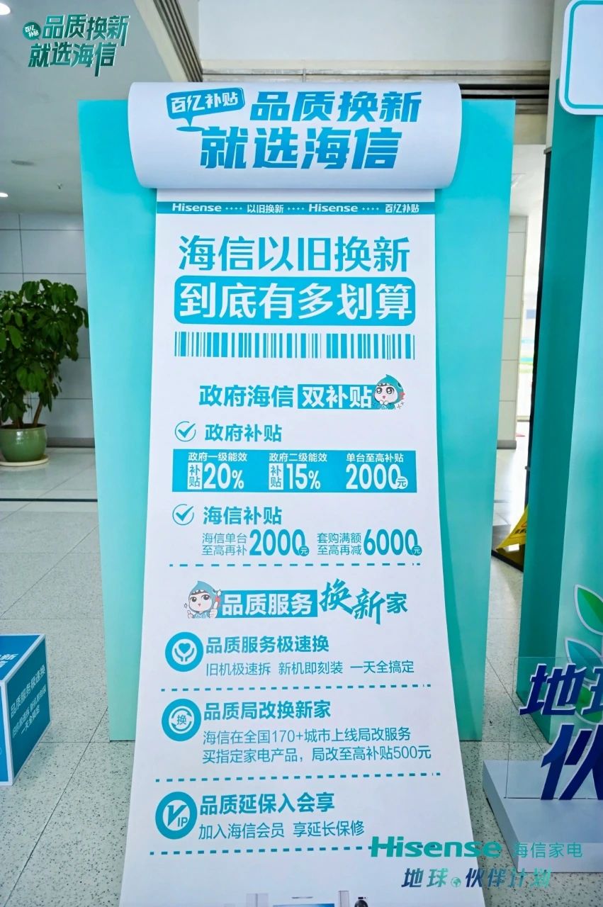 品质家电全套购。为消费者提供一站式、购齐全屋品质家电的服务。套购满额基础上,至高再减6000元;品质生活健康礼。购指定中央空调产品,至高可享价值3000元大礼;品质局改换新家。提供厨房、阳台等场景局改服务,为消费者解除家电换新的后顾之忧。品质延保入会享。消费者加入“海信爱家”会员,可获得最高一年产品延长保修服务;品质服务极速换。旧机极速拆,新机即刻装,以高效率成就高质服务体验。从产品、服务到体验、生活享受,全方位打造省时、省心、省钱的一站式换新服务。