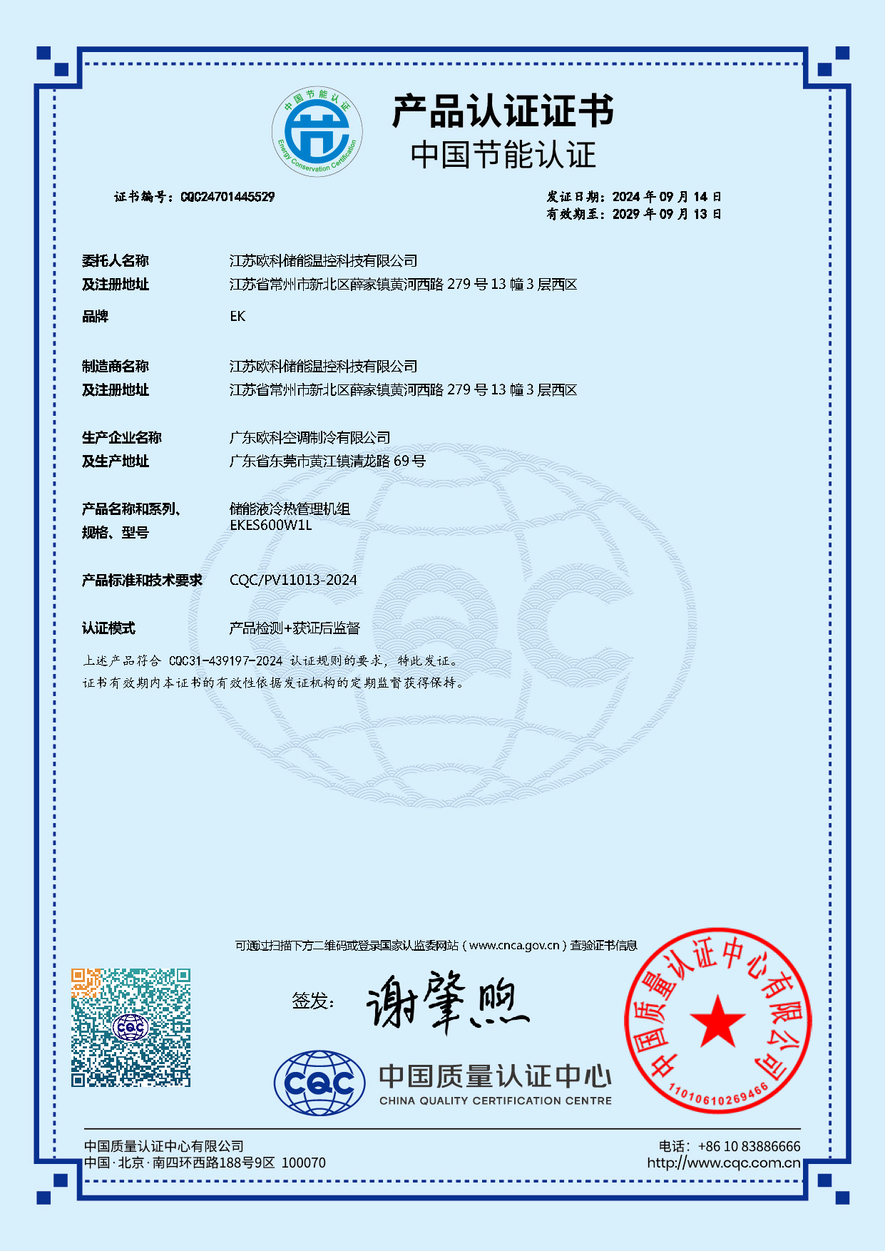 实力彰显!EK储能液冷热管理机组荣获CQC中国节能认证