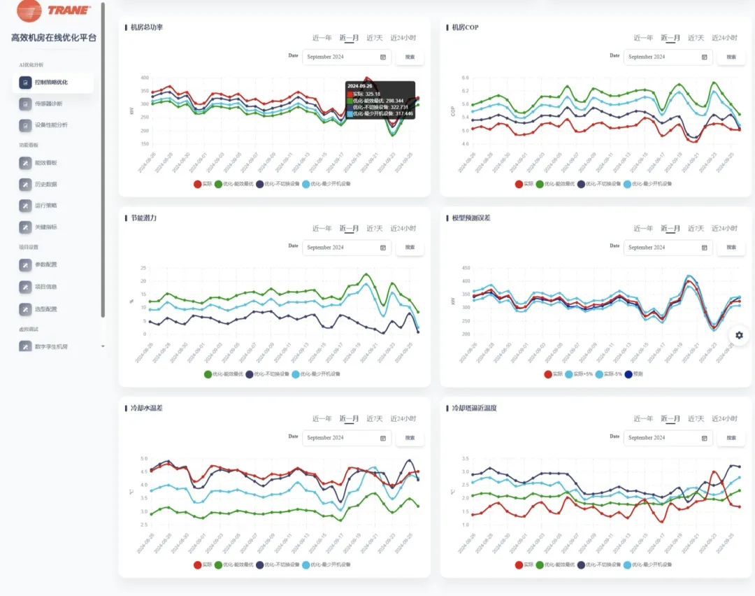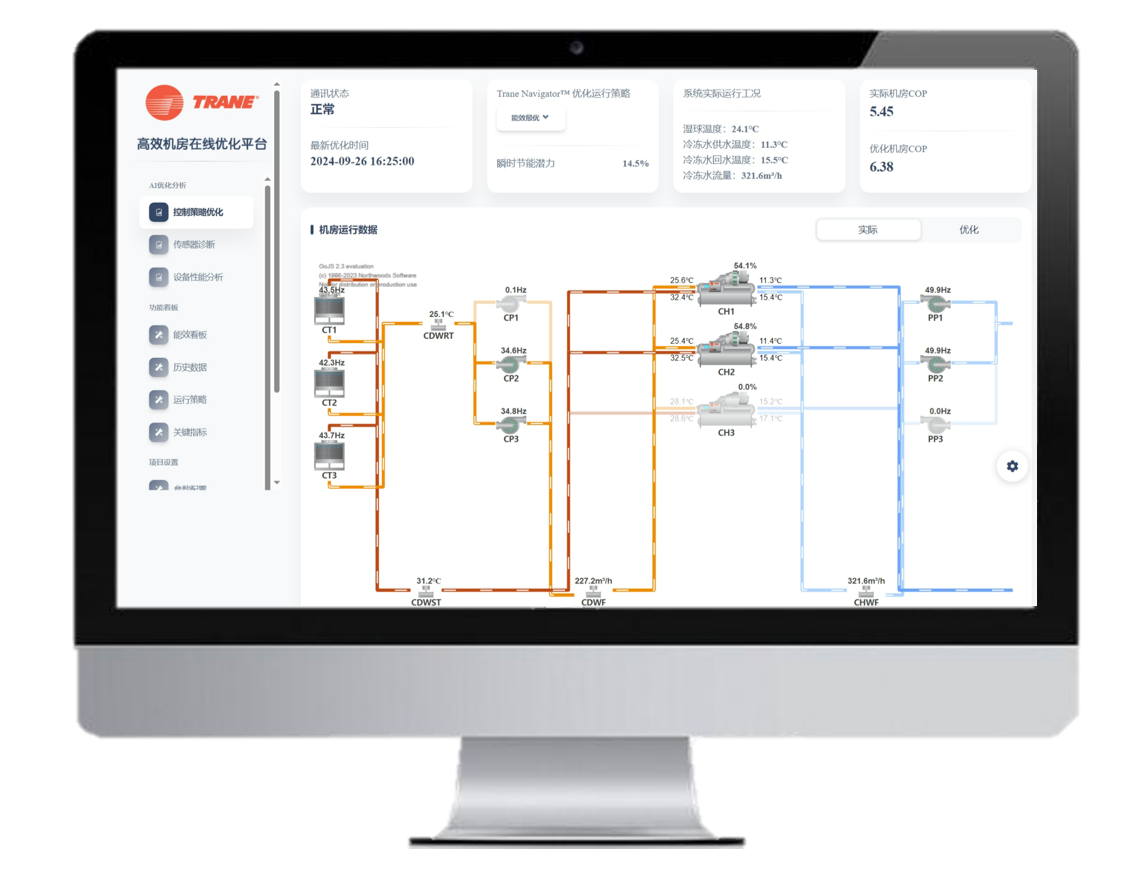 技术的创新是推动行业发展的核心动力。特灵高效机房AI在线优化系统的推广应用,促进了暖通行业技术的创新和升级。它不仅提升了系统的智能化水平,还推动了相关设备和产品的升级换代。全面采集系统各设备运行参数,深度挖掘数据价值,提供优化运行策略,对运维管理提供安全与能效的双重诊断分析并给出科学合理建议,助力中央空调系统实现长期高效、稳定运行。