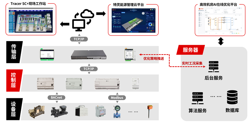特灵高效机房AI在线优化平台最大的特点是具备制冷机房系统的深度分析和实时优化能力。基于系统真实运行数据,运用成熟的机器学习算法和专业设备模型构建高精度机房系统模型,再由优化算法在模型中寻找多种最佳优化控制策略并推送到现场控制器,使得系统实际运行能效逼近理论极限。在常规自控系统基础上实现额外10%-30%的节能效果。平台采用典型的B/S架构,用户几乎可以从任何带有Web浏览器的设备来访问该平台,云部署的方式使得用户在无论在何时何地都可以非常方便地查看机房系统的运行情况。
