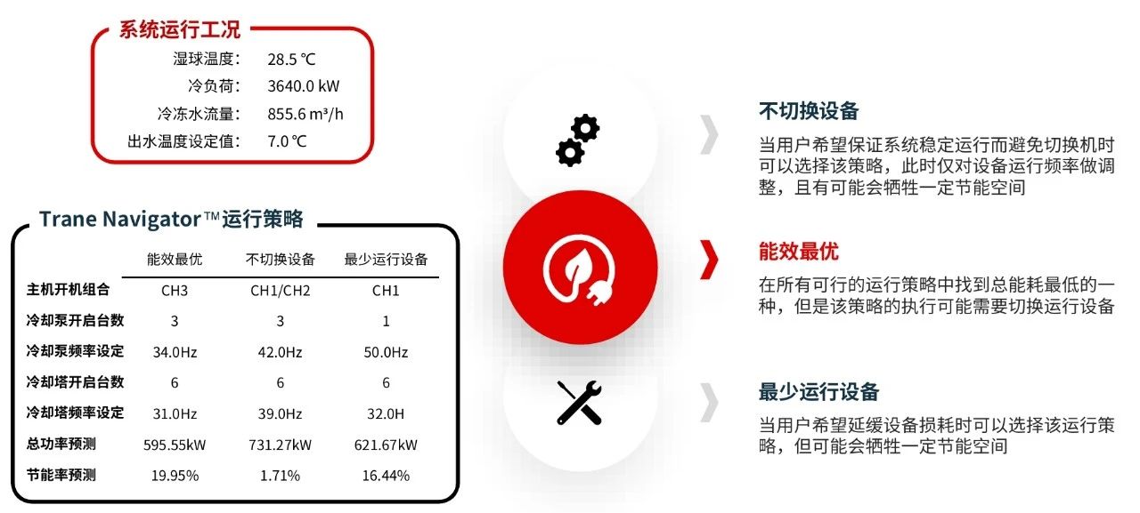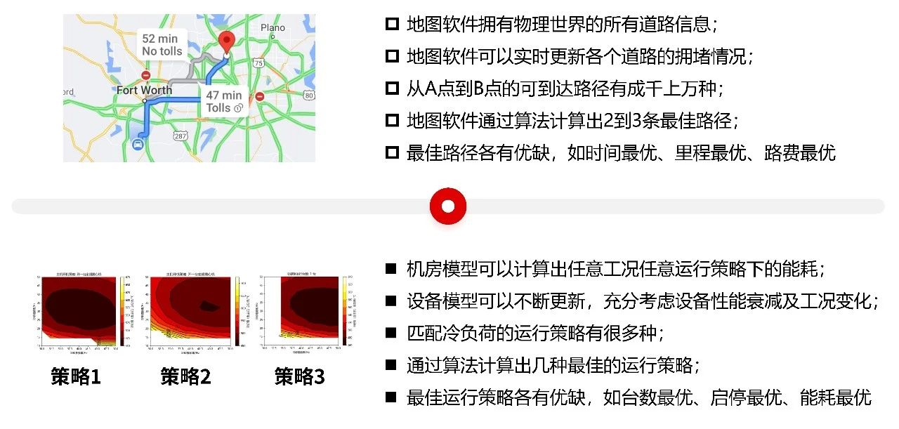 分钟级控制策略全局寻优:基于当前系统的运行工况,寻优算法在成千上万种可行的控制策略中寻找能耗最低的几种控制策略,并推送到现场控制器执行。