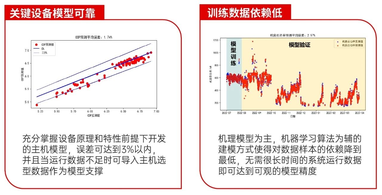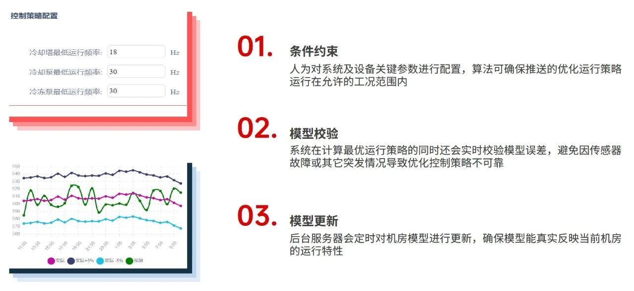 全自动系统级建模:建模过程无需人工介入,算法自动识别和筛选有效数据参与模型训练,最大程度确保模型可靠性,并运用成熟的机器学习算法和专业设备模型完成机房系统模型构建。