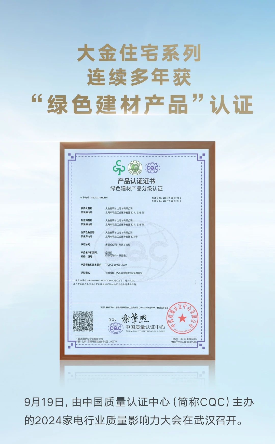 大金住宅系列连续多年获得绿色建材产品”认证-冷暖资讯-冷暖商情