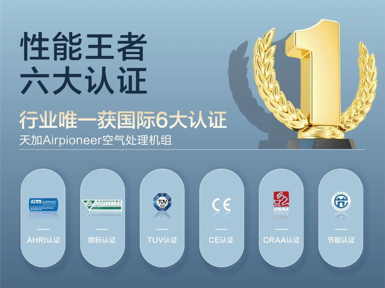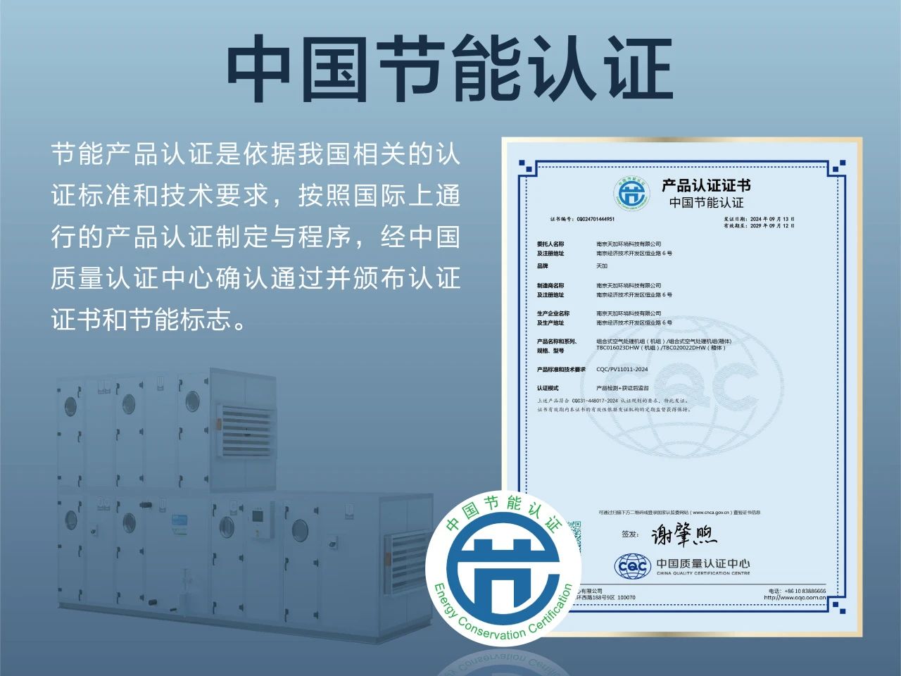 2024年9月,南京天加环境科技有限公司Airpioneer组合式空调机组凭借其卓越的技术实力、过硬的产品质量、出色的节能表现,成功通过了中国质量认证中心(CQC)的严格评审及国家空调设备质量检验检测中心的严格检测,荣获中国节能产品认证,成为行业首批获得此项认证的企业之一。这是天加Airpioneer继获得欧洲Eurovent认证、美国AHRI认证、南徳TUV认证、欧盟CE认证、国标CRAA认证后,又荣获的一项权威认证,是天加制造水平规范和跃升的体现,也是天加践行绿色低碳转型的全球战略重要环节。