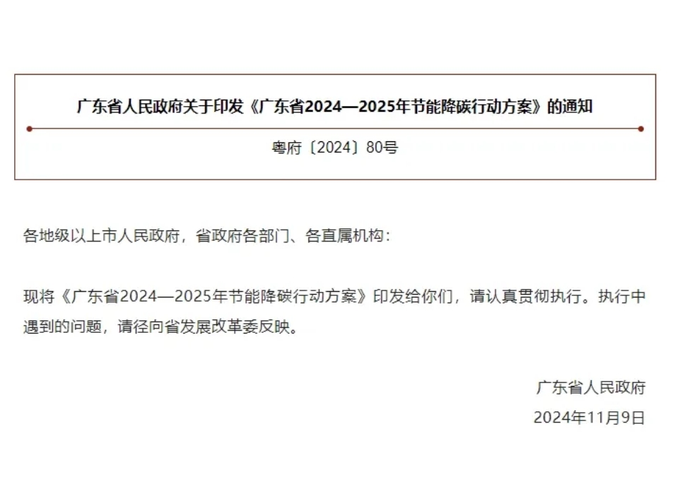 12月23日,据广东省人民政府门户网站消息,广东省人民政府印发《广东省2024—2025年节能降碳行动方案》的通知。