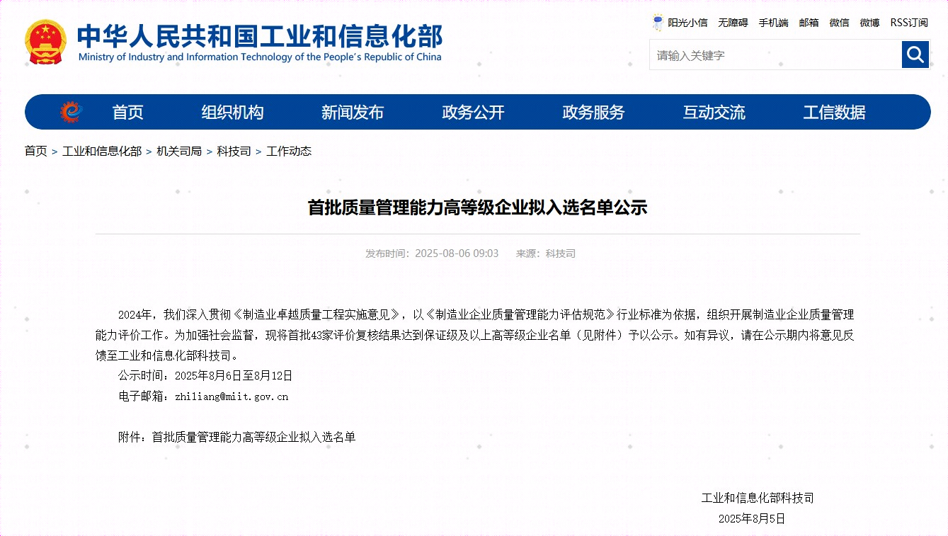 工信部企业质量管理能力评价等级作为衡量企业质量管理水平的重要权威指标,其目的在于推动各行业全面提升产品质量与服务质量,促进整个行业的健康、高质量发展。本次工信部评选以《制造业企业质量管理能力评估规范》行业标准为依据,更强调企业通过数据驱动和预防机制实现质量绩效的实质性提升。