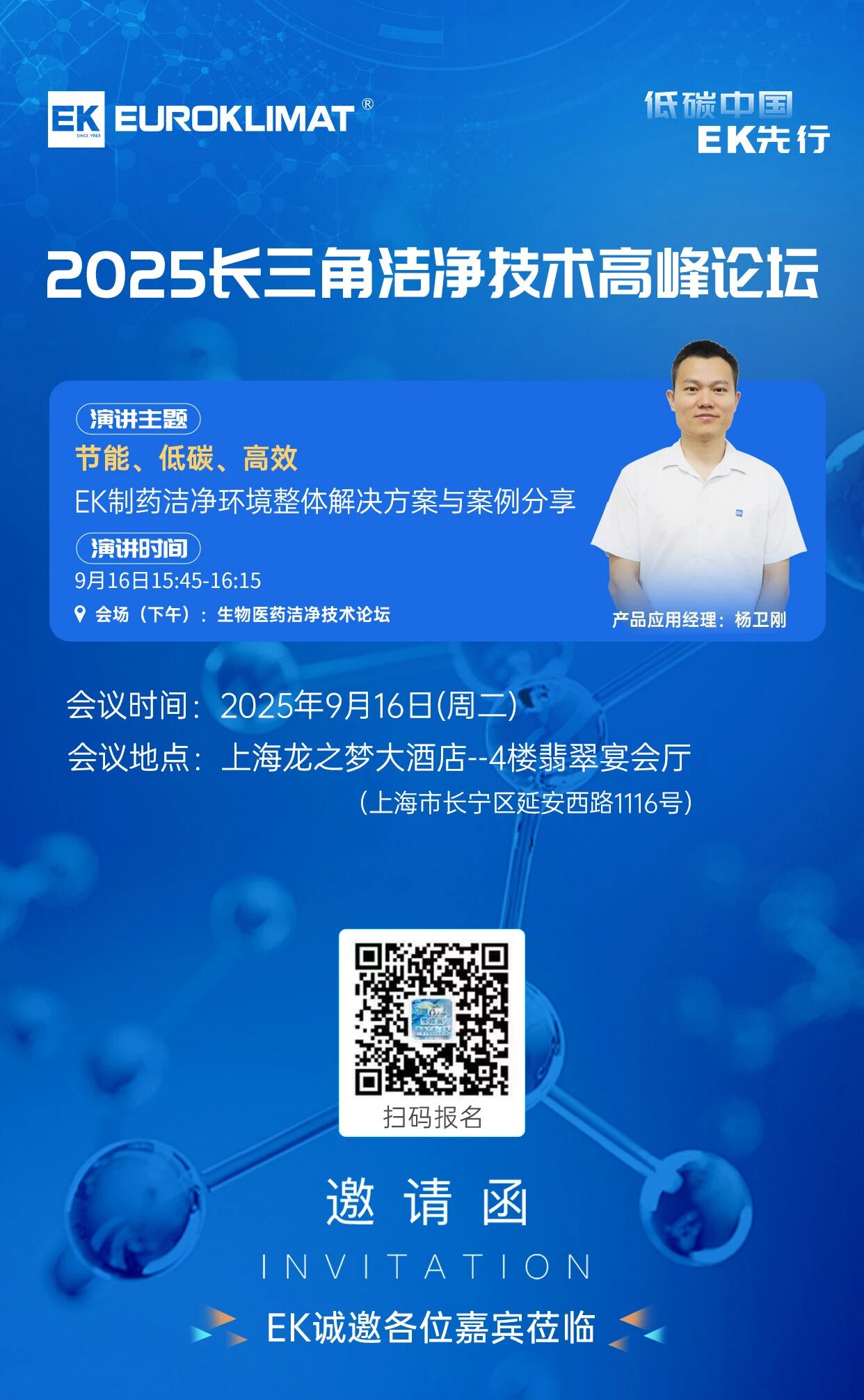 本次论坛上,EK空调将在生物医药洁净技术分论坛中精彩亮相,由EK产品应用经理杨卫刚带来题为《节能、低碳、高效——EK制药洁净环境整体解决方案与案例分享》的专题报告,分享EK制药厂房节能降碳路线和制药领域解决方案,为推动制药领域绿色低碳发展提供EK经验。