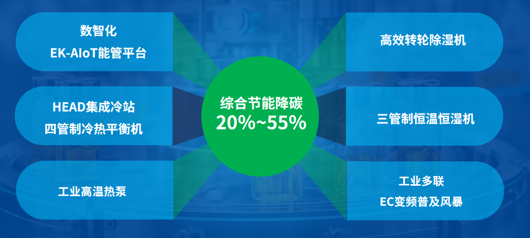 针对制药行业能耗和运维困局,EK工业空调提出完整的制药厂房节能降碳路线,系统推进洁净、冷源、热源、干燥及运维五大需求向EC、高效、低碳、节能和数智化运维方向发展。