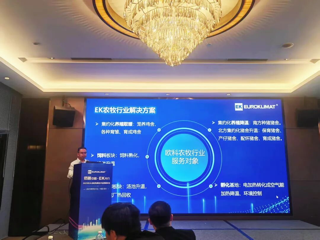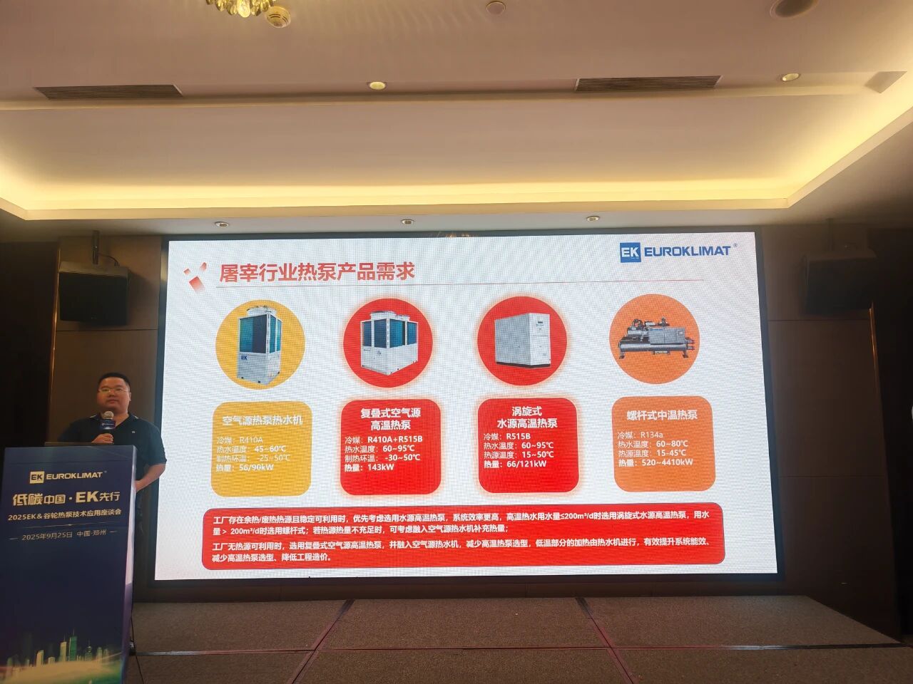 会议尾声,邹兵进一步分享EK工业高温热泵在屠宰行业应用。结合屠宰工厂的多样化用热需求,EK空调可提供空气源、复叠式高温热泵及水源高温热泵机组多种组合方案,为客户提供低碳、高效的热源选择。