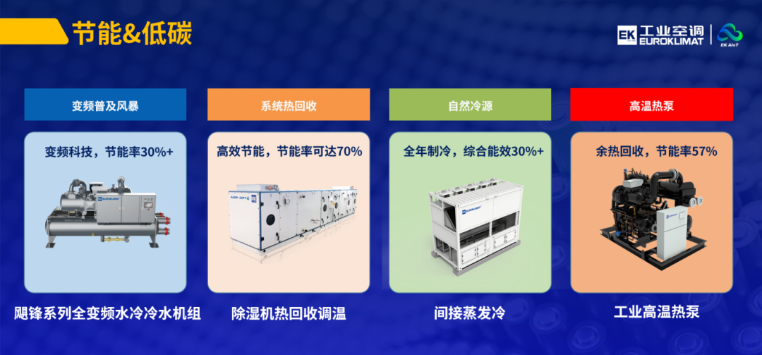 节能与低碳方面,EK工业空调不断突破技术瓶颈,通过在变频普及、系统热回收、自然冷源和高温热泵等技术领域的布局,持续降低系统能耗与碳排放。