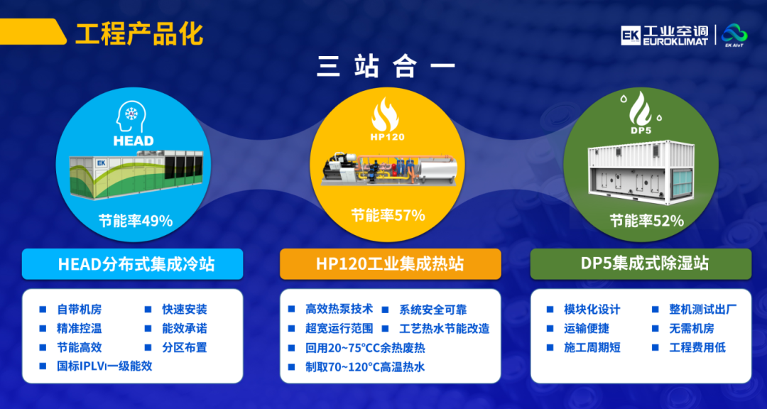 工程产品化方面,推出HEAD分布式集成冷站、HP120工业集成热站、DP5集成式除湿站等集成方案,实现从单一设备到系统解决方案的全面升级,高效快捷,缩短项目施工周期。