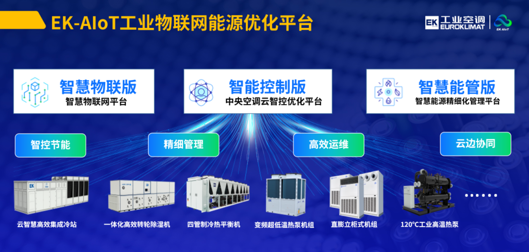 基于此,EK工业空调围绕“节能与低碳”“工程产品化”“数智化运维”三大核心战略,通过对冷热源与环境控制进行系统节能设计SED,并通过数智化运维让哑巴设备开口说话,全面助力行业节能降碳与能效升级。