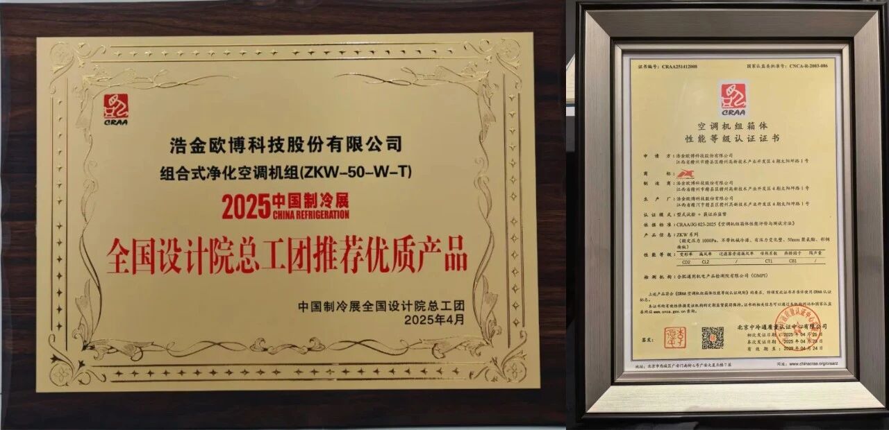 在第三十六届中国制冷展,欧博组合式净化空调机组凭借其卓越的性能和品质,一举斩获“全国设计院总工团推荐优质产品”和“首批空调机组箱体认证”两项殊荣,再次彰显了其在行业内的领先地位。