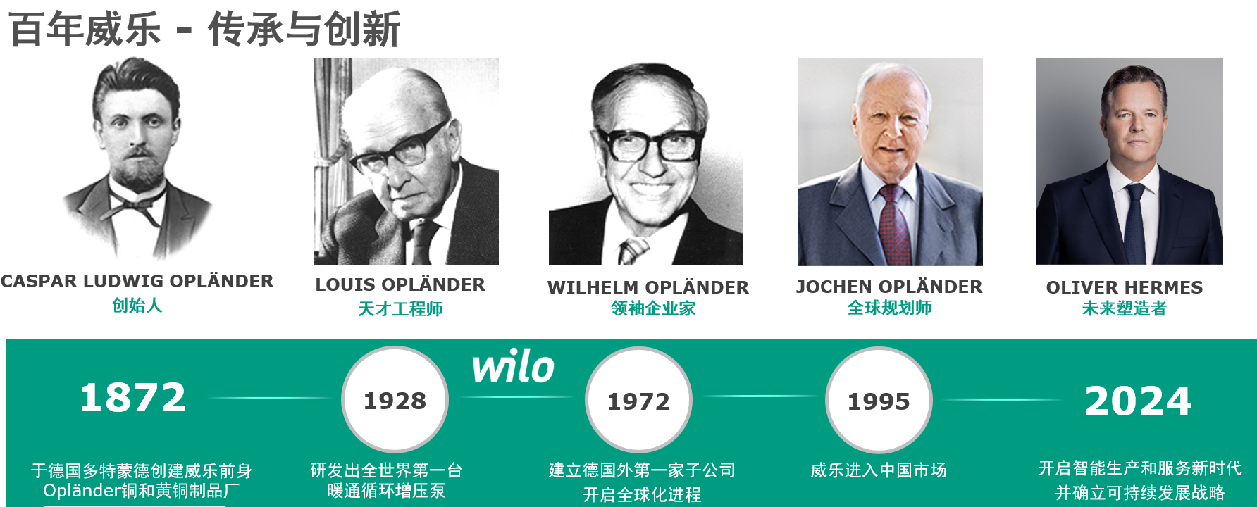 2019年,Jochen Opländer博士正式任命Oliver Hermes先生为其创业接班人,担任威乐集团首席执行官的同时兼任Opländer家族基金会Wilo Foundation的董事会主席。Oliver Hermes先生是领导这家拥有154年历史的企业的第五代领导人。
