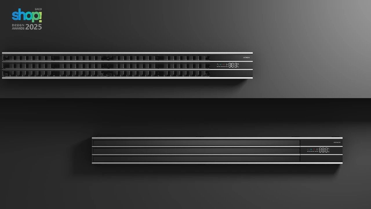 真正的设计,旨在实现功能与环境的和谐共生。荣获Winner奖的3D出风面板,打破传统出风口的平面形态,采用极简线性语言与富有层次感的三维格栅结构,配合极窄金属饰条,将出风口重构为一条精致的建筑装饰线。侧边微隐的数字化显示区域与整体面板融为一体,在满足多维舒适送风的同时,融入天花吊顶的线条设计,实现从“功能组件”到“空间美学元素”的跨越。