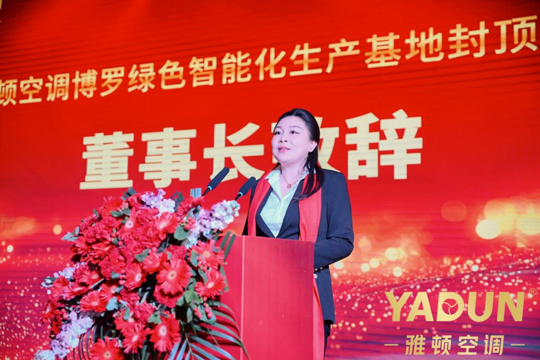 封顶仪式现场,红绸高悬映喜庆,礼炮齐鸣庆圆满,处处洋溢着热烈祥和的氛围。这喜庆的场景,既彰显了雅顿空调深耕行业的丰硕积淀,更承载着企业迈向未来的美好期许。广东雅顿空调设备制造有限公司董事长谢丽美向莅临现场的各位领导、嘉宾、合作伙伴以及所有为项目建设倾注心血、辛勤付出的全体工作人员致以最诚挚的感谢。她表示,自创立以来,雅顿空调始终坚守“客户至上,恪守承诺”的立身之本,秉持“匠心传承,品质为根”的发展理念,以精益求精的态度打造每一台经得起市场检验的优质产品。此次新建的博罗智能化生产基地,以工业4.0标准打造,集成5G全连接、AI智能控制、数字孪生等尖端技术,将为雅顿空调的全球服务网络再添强劲动力,为更多用户带去中国智造的卓越品质与高效服务。